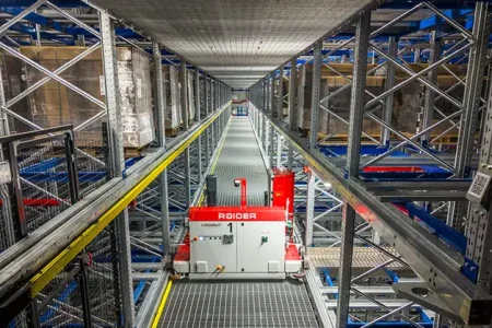 Seismic-resistant Modulblok automated pallet warehouse with special lifting stubs for storing and handling bulk loads of various sizes and weights, to which a traditional pallet system for the storage of products has been added